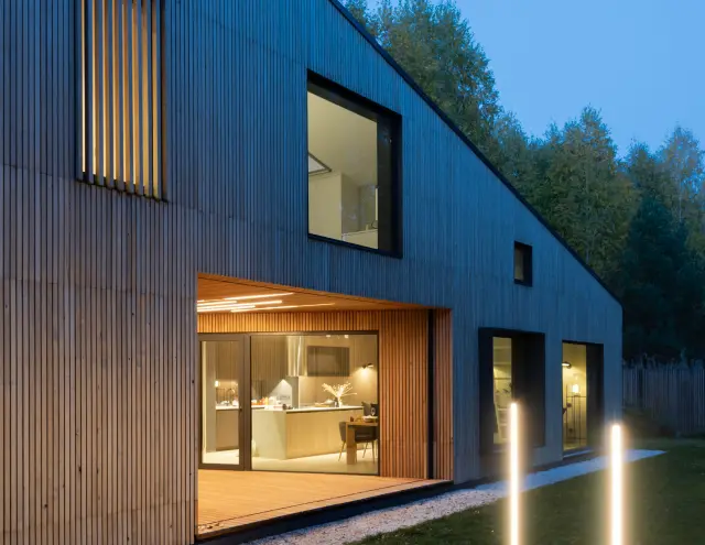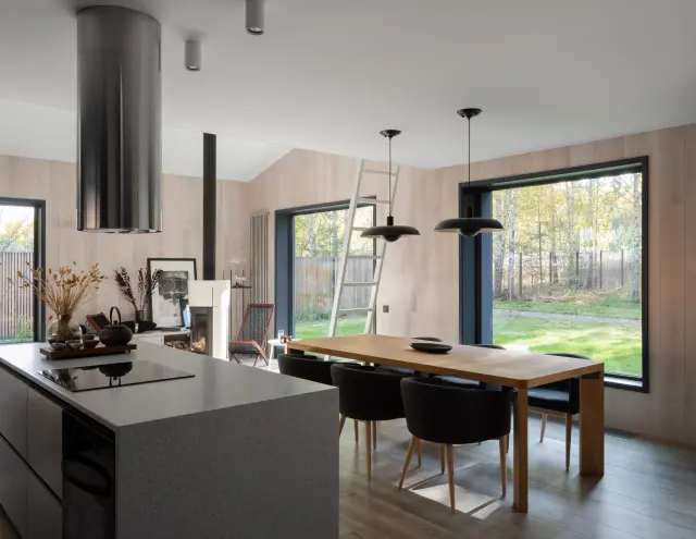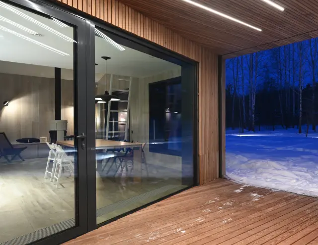 Проект каркасного дома с панорамными окнами на базе алюминиевой профильной системы ALT W72. Заказчик хотел надежные двери, поэтому мы предложили входную группу на основе системы ALT W72 D.