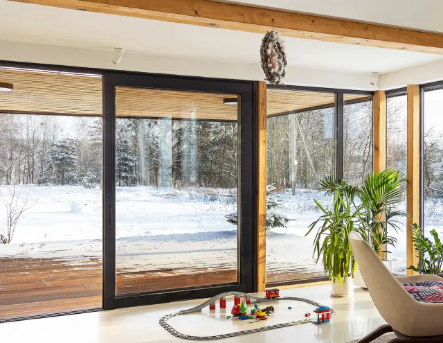 Заказчик обратился к нам за комплексным остеклением для своего загородного дома. Мы рассмотрели несколько вариантов и остановились на оконной системе ALT W72 W, дверной системе ALT W72 D и портальных раздвижных дверях из профиля ALT SL160.