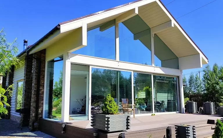 Если вы не планируете использовать зимой дополнительные пространства для отдыха, выбирайте холодное остекление террасы (веранды) на базе алюминиевых профилей. Оно защитит от сквозняков и осадков.