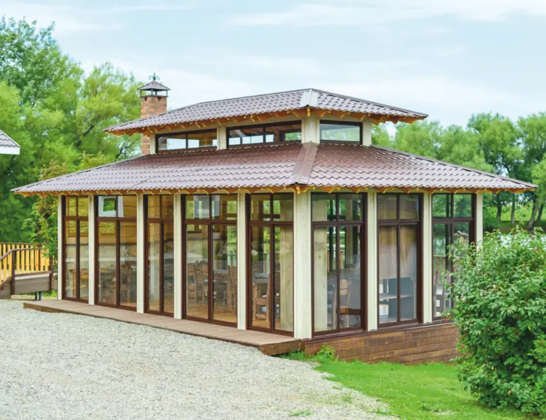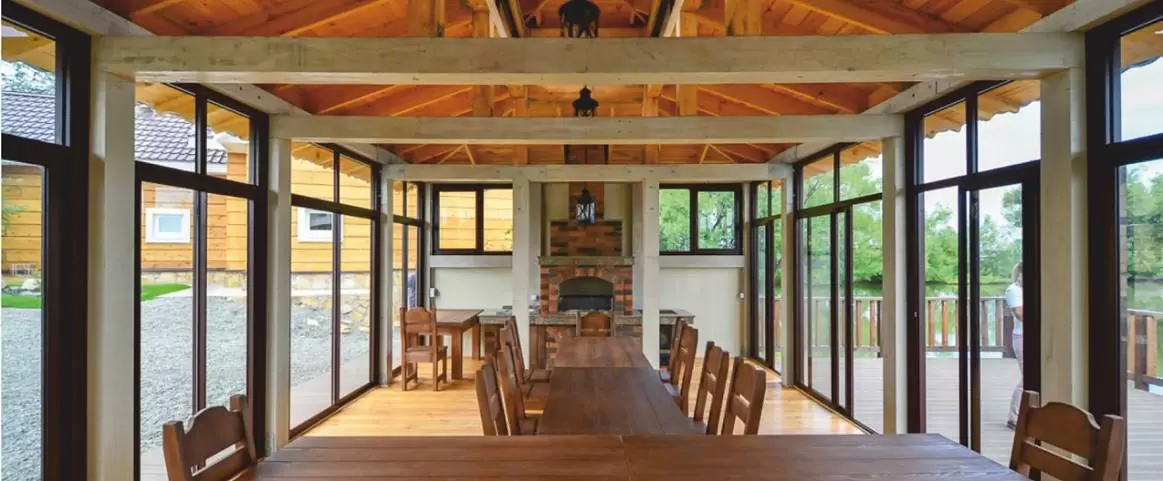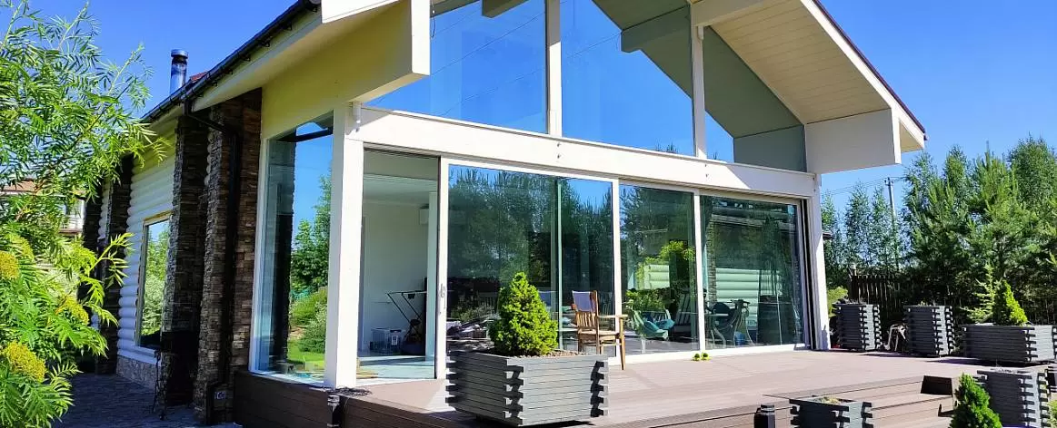 Если вы не планируете использовать зимой дополнительные пространства для отдыха, выбирайте холодное остекление террасы (веранды) на базе алюминиевых профилей. Оно защитит от сквозняков и осадков.