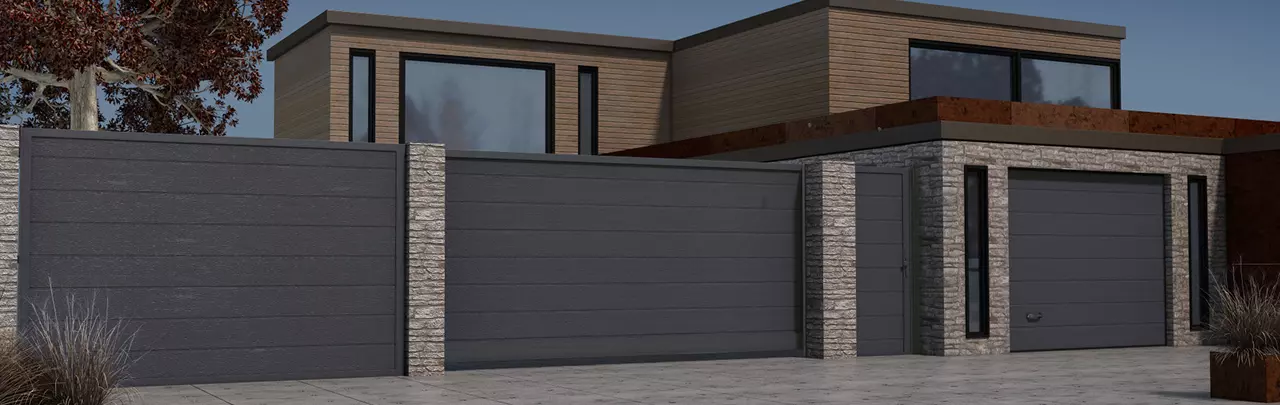 Неповторимый вид воротам придает комбинированное заполнение, которое позволяет сочетать между собой сэндвич-панели, алюминиевый и роллетный профили в различных вариациях.
